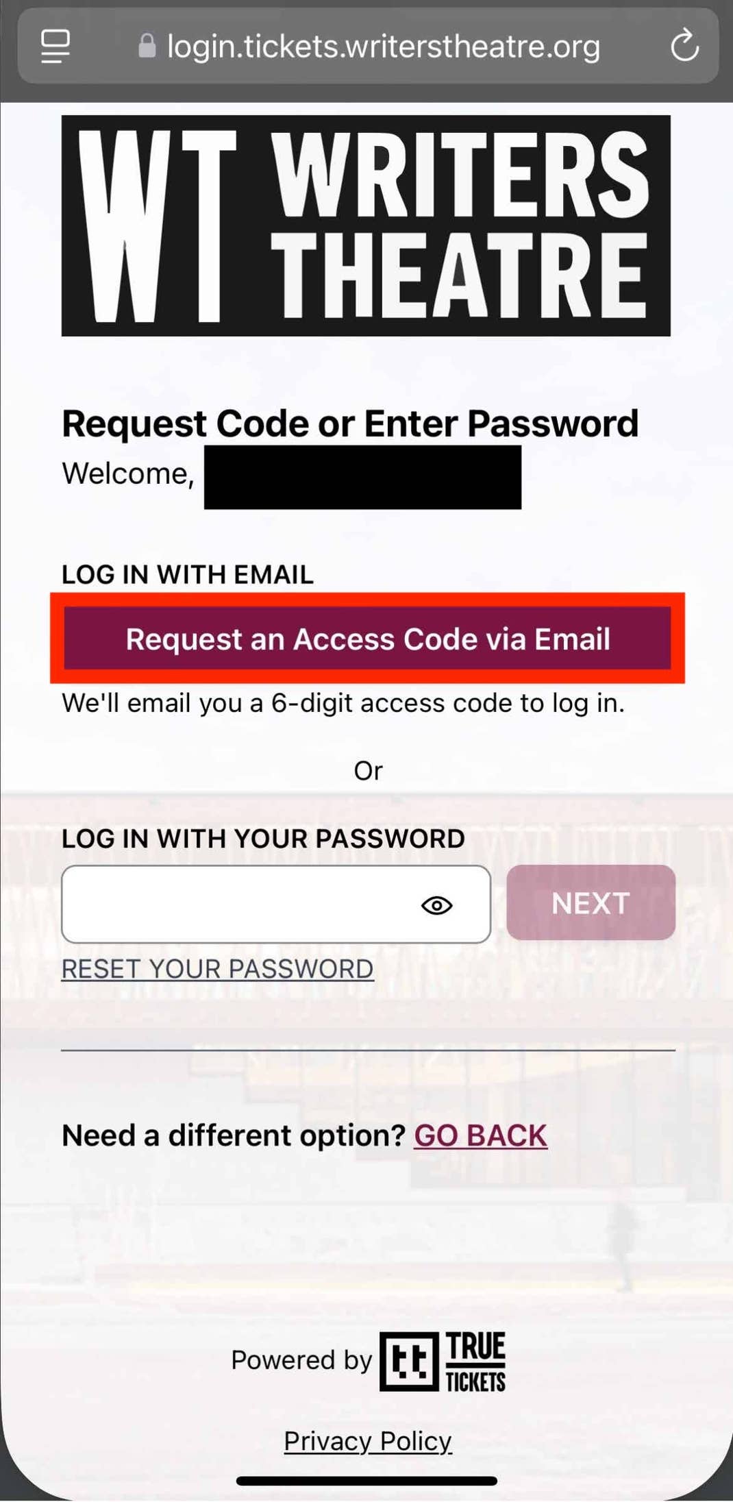 Log in to your digital ticket wallet using the same email address used to purchase your tickets. You can request an access code be sent to your email or use your password by clicking the “log in with your password”.