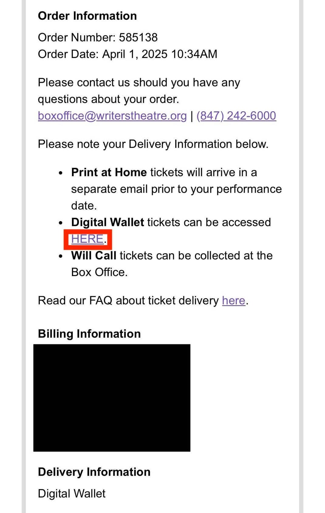 If none of these apply, contact the Box Office Team at 847-242-6000 or boxoffice@writerstheatre.org, or visit the Box Office upon arrival at your event.