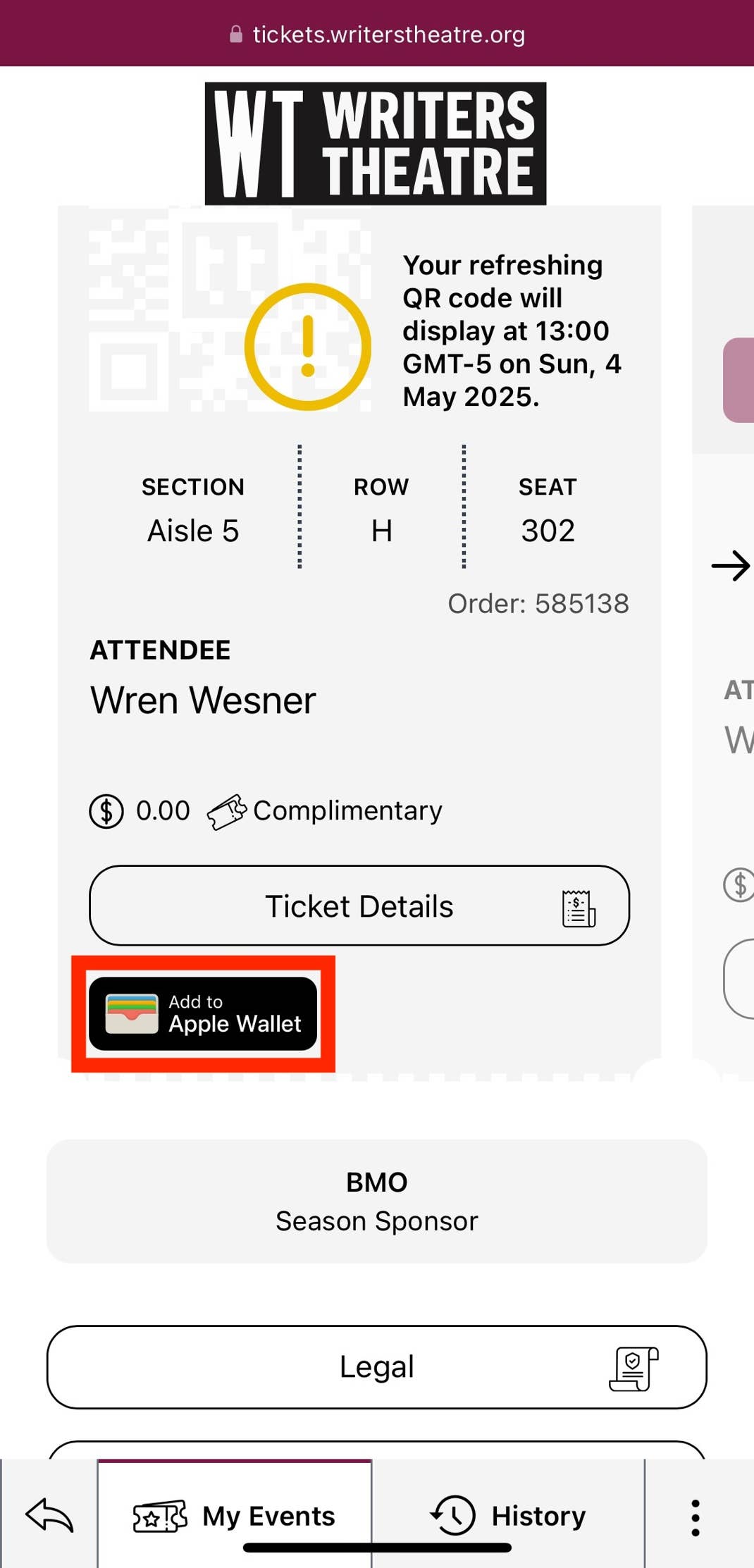 As a safety measure, the QR codes will not be visible on your tickets until one hour before your performance start time. Your QR code for your digital tickets will automatically appear in your digital wallet at that time.