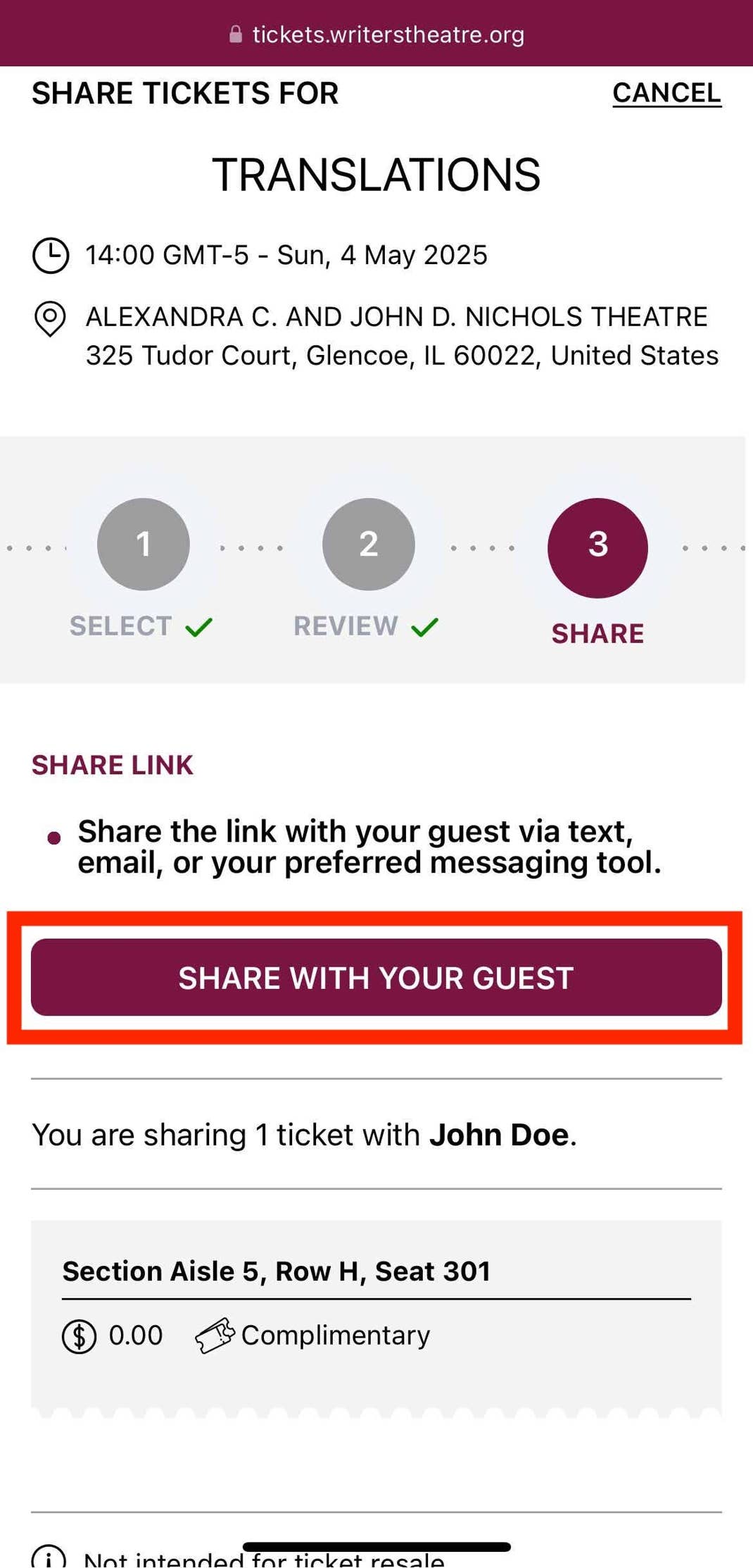2. Ticket Shared with (Your Guest’s Name) Pending